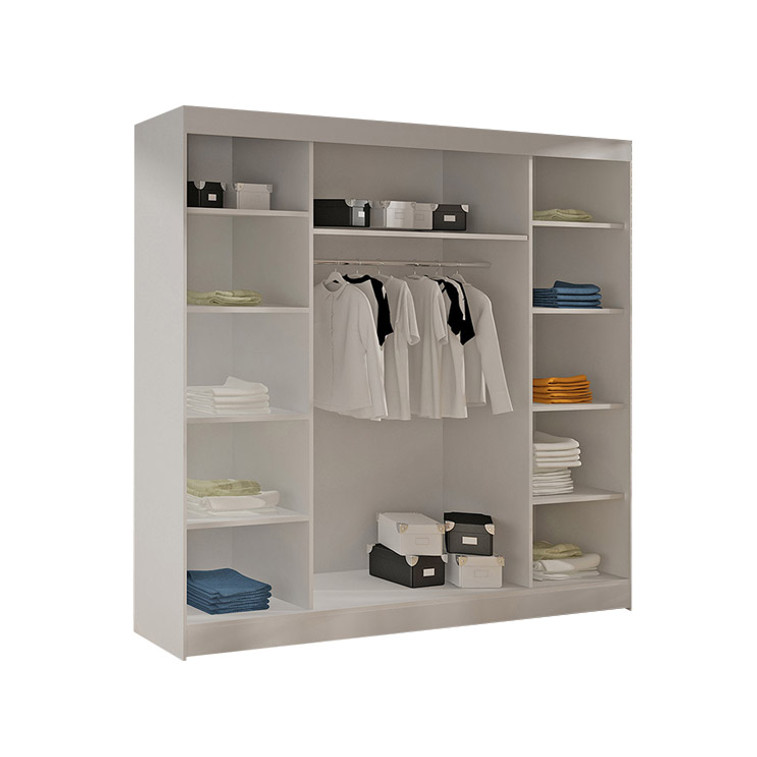 Priestranná šatníková skriňa BASTI II je vyrobená v modernom dizajne a ponúka veľké množstvo praktického úložného priestoru (viď obrázok). Neoceniteľný je systém trendových posuvných dverí so zrkadlom, ktoré uľahčujú manipuláciu a šetria priestor v interiéri. Korpus a dvere sú vyrobené z kvalitného lamina (16 mm). Šatníková skriňa BASTI II môže doplniť existujúce vybavenie izby. Údržba je jednoduchá, povrch je ľahko umývateľný, odolný voči pôsobeniu vody a zvýšenej teplote. Skriňa je dodávaná v demonte a v rôznom farebnom prevedení.
