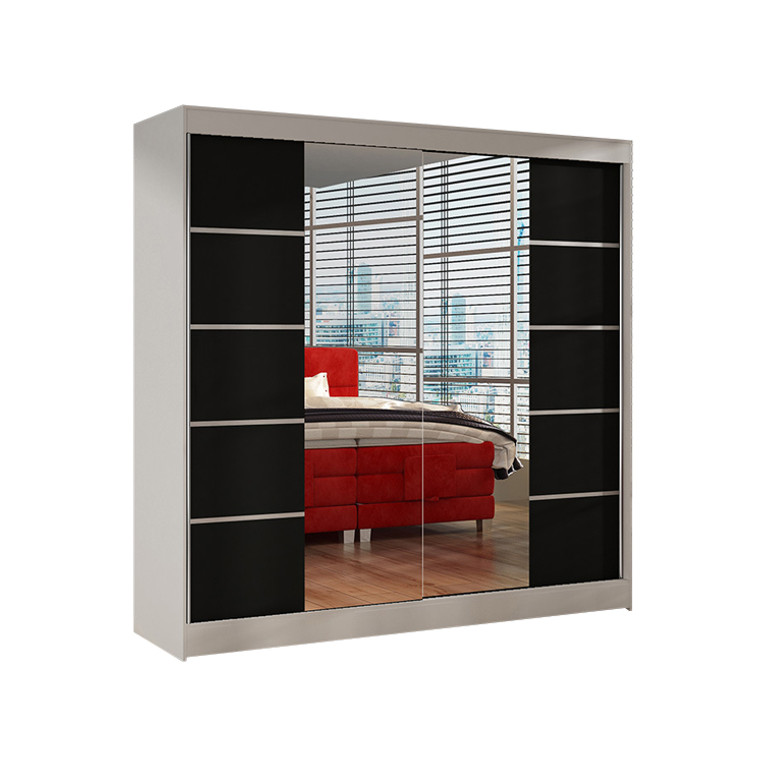 Priestranná šatníková skriňa BASTI V je vyrobená v modernom dizajne a ponúka veľké množstvo praktického úložného priestoru (viď obrázok). Neoceniteľný je systém trendových posuvných dverí so zrkadlom, ktoré uľahčujú manipuláciu a šetria priestor v interiéri. Korpus a dvere sú vyrobené z kvalitného lamina (16 mm). Šatníkovou skriňou BASTI V si môžete doplniť existujúce vybavenie izby. Údržba je jednoduchá, povrch je ľahko umývateľný, odolný voči pôsobeniu vody a zvýšenej teplote. Skriňa je dodávaná v demonte a v rôznom farebnom prevedení.