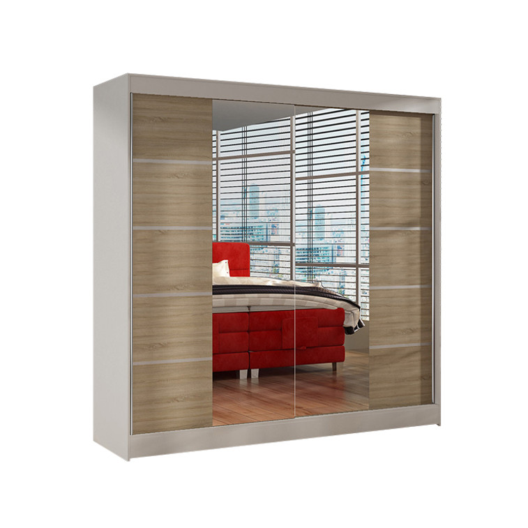 Priestranná šatníková skriňa BASTI V je vyrobená v modernom dizajne a ponúka veľké množstvo praktického úložného priestoru (viď obrázok). Neoceniteľný je systém trendových posuvných dverí so zrkadlom, ktoré uľahčujú manipuláciu a šetria priestor v interiéri. Korpus a dvere sú vyrobené z kvalitného lamina (16 mm). Šatníkovou skriňou BASTI V si môžete doplniť existujúce vybavenie izby. Údržba je jednoduchá, povrch je ľahko umývateľný, odolný voči pôsobeniu vody a zvýšenej teplote. Skriňa je dodávaná v demonte a v rôznom farebnom prevedení.