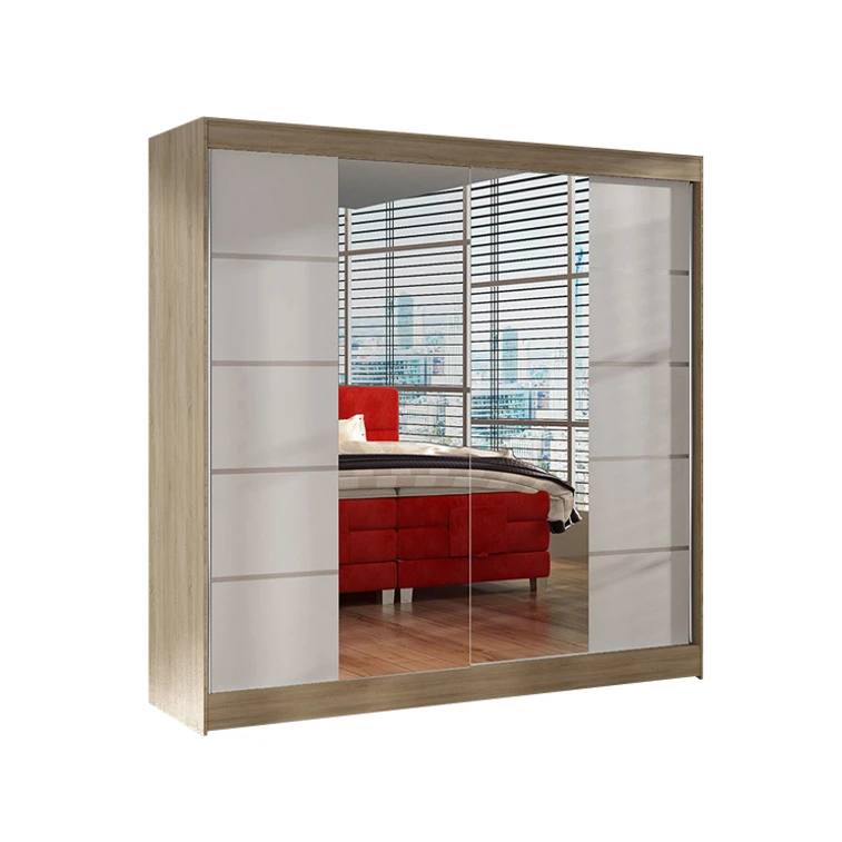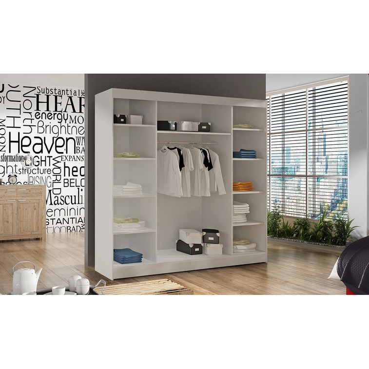 Priestranná šatníková skriňa BASTI V je vyrobená v modernom dizajne a ponúka veľké množstvo praktického úložného priestoru (viď obrázok). Neoceniteľný je systém trendových posuvných dverí so zrkadlom, ktoré uľahčujú manipuláciu a šetria priestor v interiéri. Korpus a dvere sú vyrobené z kvalitného lamina (16 mm). Šatníkovou skriňou BASTI V si môžete doplniť existujúce vybavenie izby. Údržba je jednoduchá, povrch je ľahko umývateľný, odolný voči pôsobeniu vody a zvýšenej teplote. Skriňa je dodávaná v demonte a v rôznom farebnom prevedení.