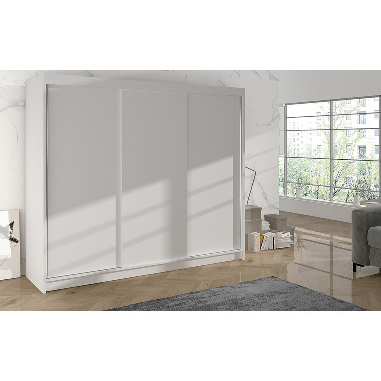 Priestranná šatníková skriňa DERBY II je vyrobená v modernom dizajne a ponúka veľké množstvo praktického úložného priestoru (viď obrázok). Neoceniteľný je systém trendových posuvných dverí, ktoré uľahčujú manipuláciu a šetria priestor v interiéri. Korpus a dvere sú vyrobené z kvalitného lamina (16 mm). Šatníková skriňa DERBY II si môžete doplniť existujúce vybavenie izby. Údržba je jednoduchá, povrh je ľahko umývateľný, odolný voči pôsobeniu vody a zvýšenej teplote. Skriňa je dodávaná v demonte a v rôznom farebnom prevedení. V prípade dotazu nás neváhajte kontaktovať.