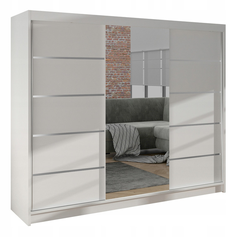 Priestranná šatníková skriňa DERBY VI je vyrobená v modernom dizajne a ponúka veľké množstvo praktického úložného priestoru (viď obrázok). Neoceniteľný je systém trendových posuvných dverí so zrkadlom, ktoré uľahčujú manipuláciu a šetria priestor v interiéri. Korpus a dvere sú vyrobené z kvalitného lamina (16 mm). Šatníková skriňa DERBY VI si môžete doplniť existujúce vybavenie izby. Údržba je jednoduchá, povrh je ľahko umývateľný, odolný voči pôsobeniu vody a zvýšenej teplote. Skriňa je dodávaná v demonte a v rôznom farebnom prevedení. V prípade dotazu nás neváhajte kontaktovať.