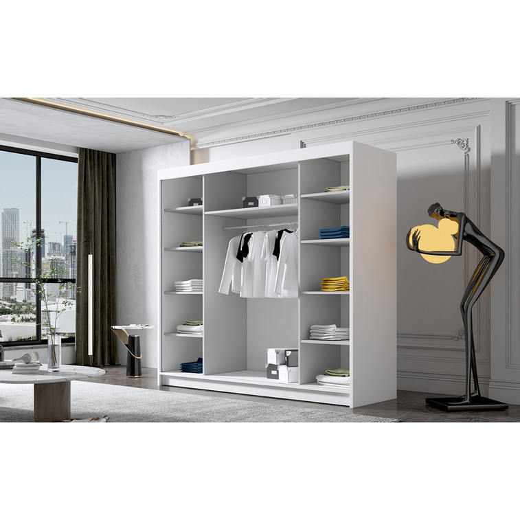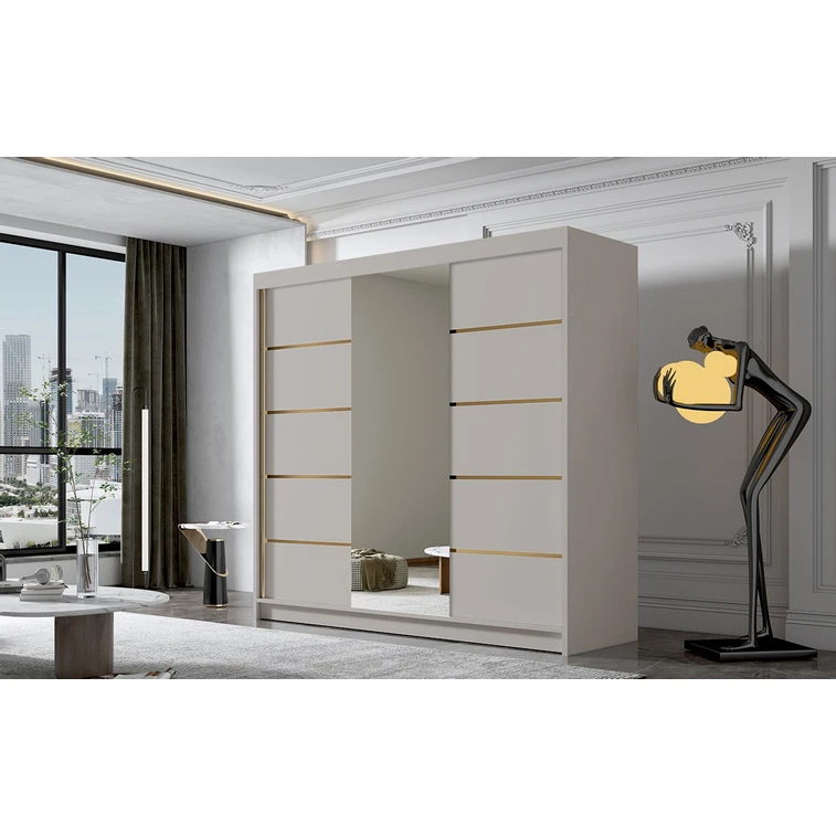 Posuvná šatníková skriňa EVO VI kombinuje klasickú jednoduchosť a moderný dizajn. Zrkadlo umiestnené na dverách dodáva svoje jedinečné kúzlo. Je ideálna ako šatníková skriňa do predsiene alebo miesto na uloženie oblečenia v spálni alebo iných drobností každodennej potreby.