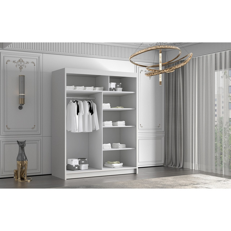Posuvná šatníková skriňa Flavio III kombinuje klasickú jednoduchosť a moderný dizajn. Zrkadlo umiestnené na dverách dodáva svoje jedinečné kúzlo. Je ideálna ako šatníková skriňa do predsiene alebo miesto na uloženie oblečenia v spálni alebo iných drobností každodennej potreby. Vnútro šatníkovej skrine je rozdelené na dve rovnaké časti. Na jednej strane sú police a na druhej strane je závesná šatníková tyč.