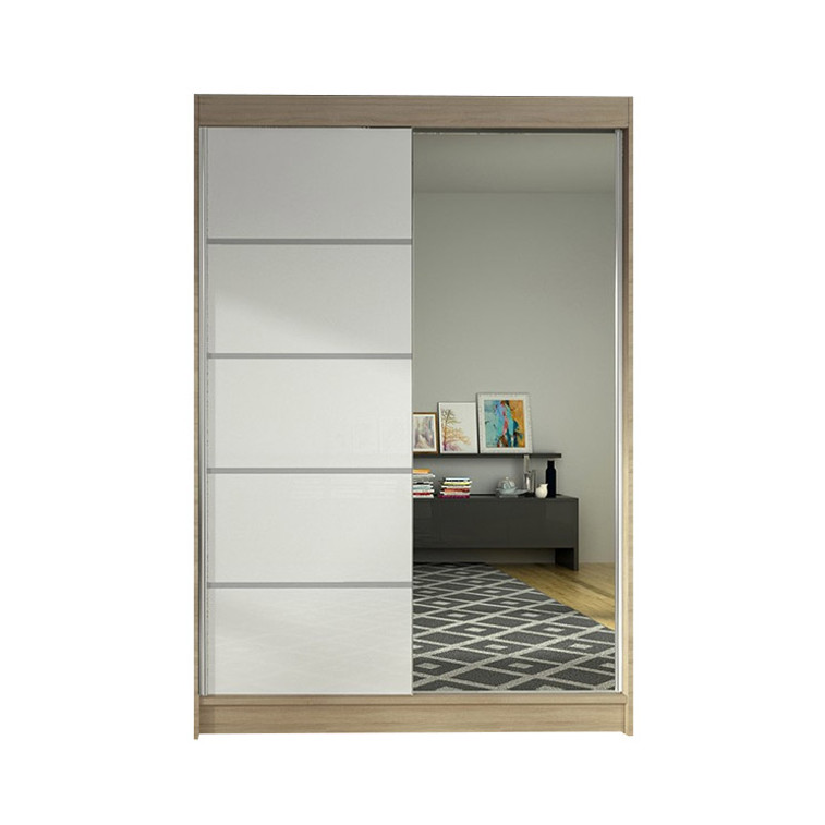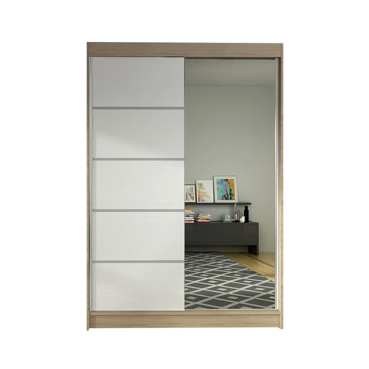 Šatníková skriňa LINO III s posuvnými dverami je vo veľmi elegantnom a praktickom prevedení. Na dverách skrine je zrkadlo. Vnútorná časť je rozdelená na dve polovice. V jednej časti sú police, v druhej časti je vešiaková tyč. Skriňa má hliníkové ložiskové pojazdy Micra Sevroll, korpus aj dvierka sú vyrobené z kvalitného lamina (16 mm). Dodávame v demontovanom stave.