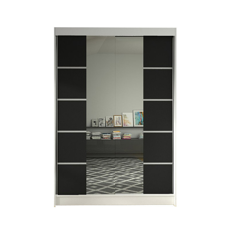 Šatníková skriňa LINO V s posuvnými dverami je vo veľmi elegantnom a praktickom prevedení. Na dverách skrine je zrkadlo. Vnútorná časť je rozdelená na dve polovice. V jednej časti sú police, v druhej časti je vešiaková tyč. Skriňa má hliníkové ložiskové pojazdy Micra Sevroll, korpus aj dvierka sú vyrobené z kvalitného lamina (16 mm). Dodávame v demontovanom stave.