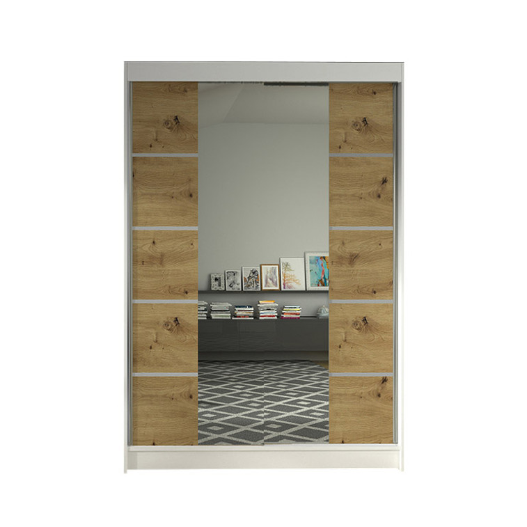 Šatníková skriňa LINO V s posuvnými dverami je vo veľmi elegantnom a praktickom prevedení. Na dverách skrine je zrkadlo. Vnútorná časť je rozdelená na dve polovice. V jednej časti sú police, v druhej časti je vešiaková tyč. Skriňa má hliníkové ložiskové pojazdy Micra Sevroll, korpus aj dvierka sú vyrobené z kvalitného lamina (16 mm). Dodávame v demontovanom stave.