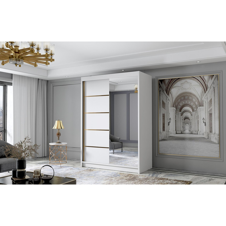 Posuvná šatníková skriňa Lungo III kombinuje klasickú jednoduchosť a moderný dizajn. Zrkadlo umiestnené na dverách dodáva svoje jedinečné kúzlo. Je ideálna ako šatníková skriňa do predsiene alebo miesto na uloženie oblečenia v spálni alebo iných drobností každodennej potreby. Vnútro šatníkovej skrine je rozdelené na dve rovnaké časti. Na jednej strane sú police a na druhej strane je závesná šatníková tyč.
