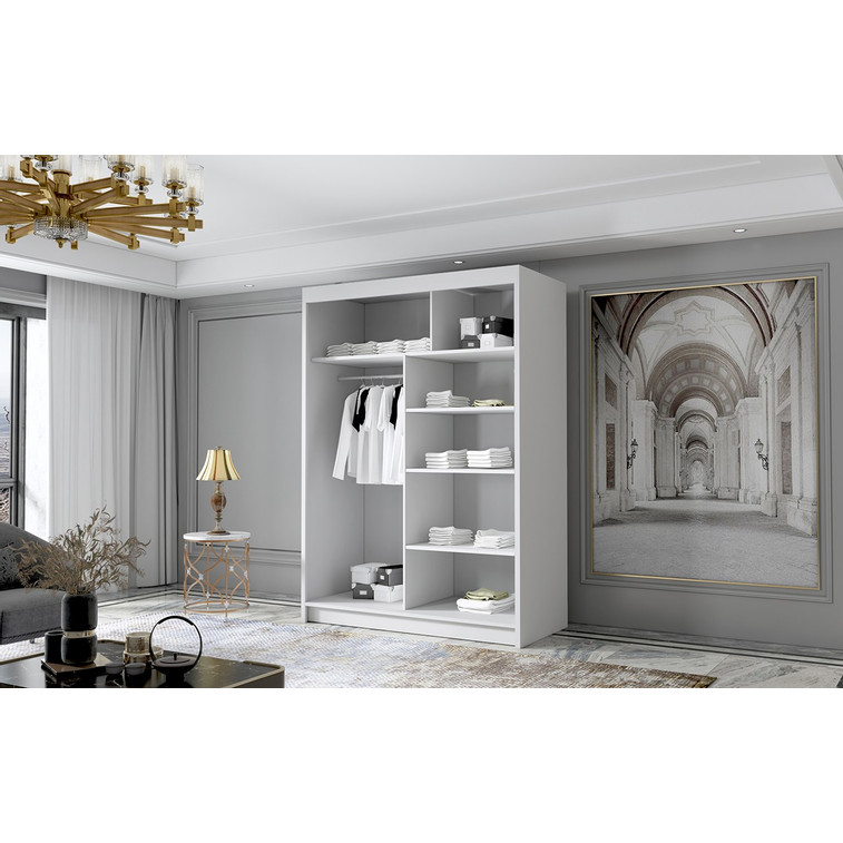 Posuvná šatníková skriňa Lungo III kombinuje klasickú jednoduchosť a moderný dizajn. Zrkadlo umiestnené na dverách dodáva svoje jedinečné kúzlo. Je ideálna ako šatníková skriňa do predsiene alebo miesto na uloženie oblečenia v spálni alebo iných drobností každodennej potreby. Vnútro šatníkovej skrine je rozdelené na dve rovnaké časti. Na jednej strane sú police a na druhej strane je závesná šatníková tyč.