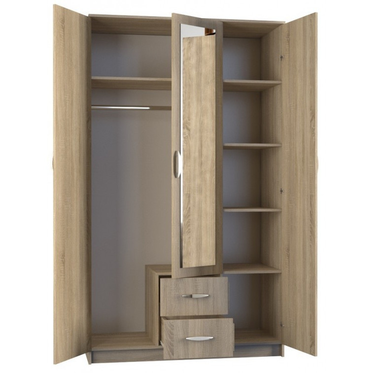 Šatníková skriňa Romana s dtromi dvierkami a dvomi zásuvkami. V ľavej časti skrine sa nachádza vešiaková tyč, v pravej časti so zrkadlom sa nachádzajú police. Skriňa je vyrobená z kvalitného lamina ( 16 mm ).