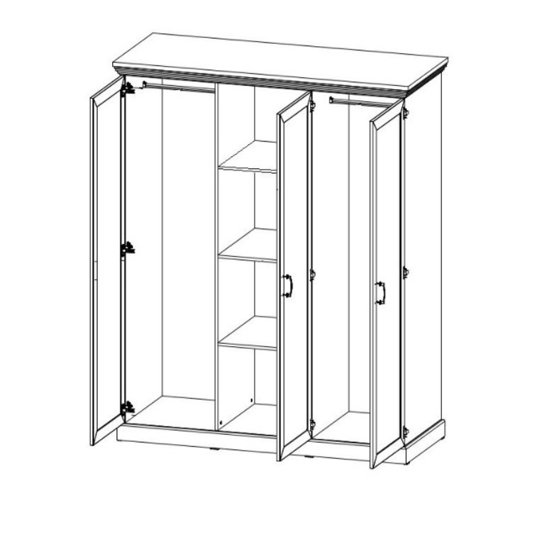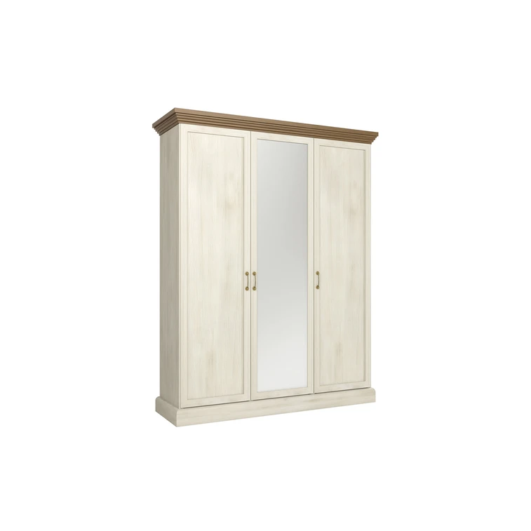 Šatníková skriňa Royal S3D je vytvorená v anglickom štýle. Zostava nábytku vnesie do Vášho domova štýl a eleganciu. Nábytkom si môžete zariadiť celý svoj domov - jedáleň, spálňu, obývaciu izbu, kuchyňu alebo predsieň. Nábytok je vyrobený z veľmi kvalitného lamina v kombinácii s MDF vo farebnom prevedení Borovica nordická (korpus a predné plochy nábytku) s Dubom divokým (horné plochy nábytku). Skriňa je veľmi praktická a ponúka veľký úložný priestor. Vnútorné usporiadanie skrine - 2. šatníkové tyče + 3 police. Na prostredných dverách do skrine je zrkadlo. Dodávame v demontovanom stave.