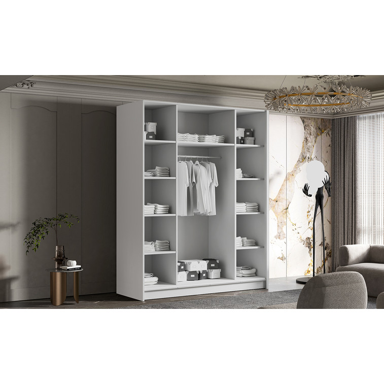 Šatníková skriňa kombinuje klasickú jednoduchosť a moderný dizajn. Je ideálna ako šatníková skriňa do predsiene alebo miesto na uloženie oblečenia v spálni alebo iných drobností každodennej potreby. Šatníková skriňa je rozdelená na tri časti. Po stranách sú police a uprostred je závesná šatníková tyč.