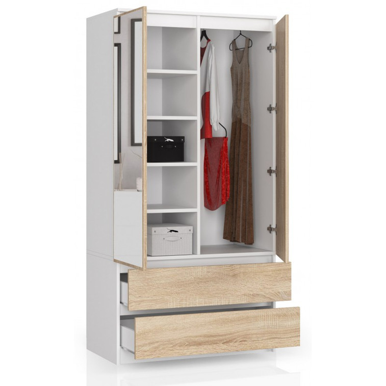 Šatníková skriňa so zrkadlami S90 2 dvierka 2 zásuvky biela/dub sonoma