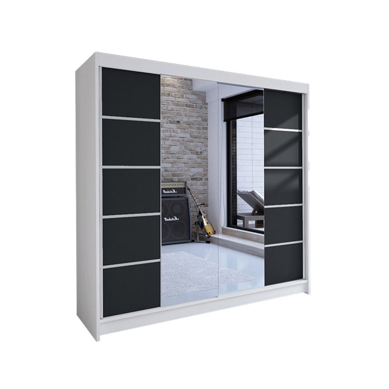 Priestranná šatníková skriňa TALIN V je vyrobená v modernom dizajne a ponúka veľké množstvo praktického úložného priestoru (viď obrázok). Neoceniteľný je systém trendových posuvných dverí so zrkadlom, ktoré uľahčujú manipuláciu a šetria priestor v interiéri. Korpus a dvere sú vyrobené z kvalitného lamina (16 mm). Šatníkovou skriňou TALIN V si môžete doplniť existujúce vybavenie izby. Údržba je jednoduchá, povrch je ľahko umývateľný, odolný voči pôsobeniu vody a zvýšenej teplote. Skriňa je dodávaná v demonte a v rôznom farebnom prevedení.