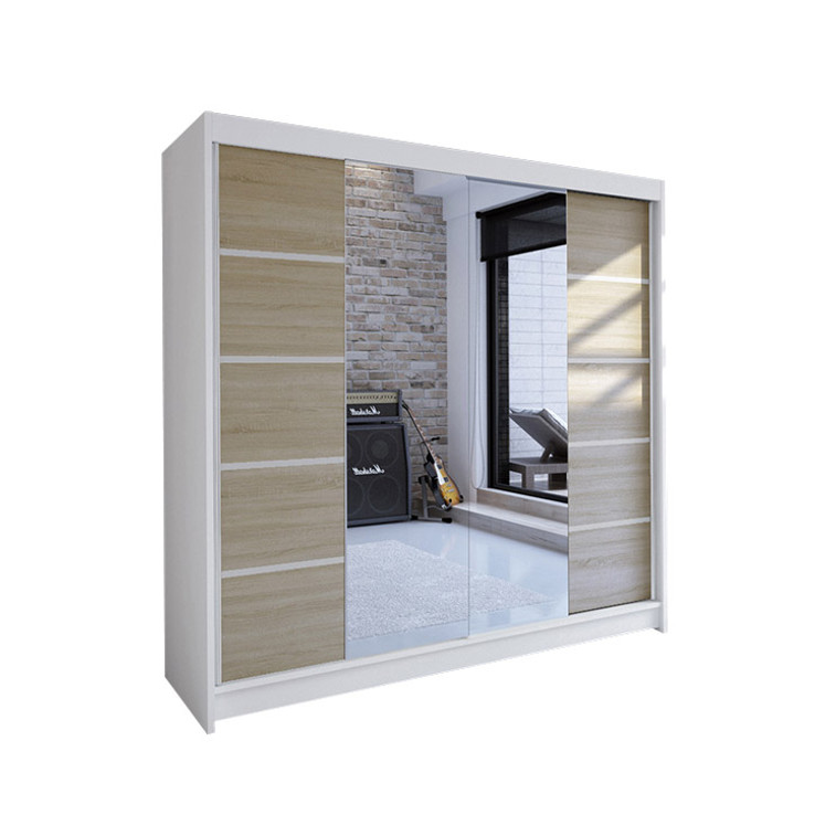 Priestranná šatníková skriňa TALIN V je vyrobená v modernom dizajne a ponúka veľké množstvo praktického úložného priestoru (viď obrázok). Neoceniteľný je systém trendových posuvných dverí so zrkadlom, ktoré uľahčujú manipuláciu a šetria priestor v interiéri. Korpus a dvere sú vyrobené z kvalitného lamina (16 mm). Šatníkovou skriňou TALIN V si môžete doplniť existujúce vybavenie izby. Údržba je jednoduchá, povrch je ľahko umývateľný, odolný voči pôsobeniu vody a zvýšenej teplote. Skriňa je dodávaná v demonte a v rôznom farebnom prevedení.