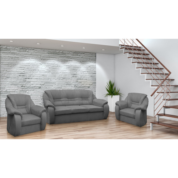 Set - pohovka + 2 kreslá Roma. Sedacia súprava je vyrobená z kvalitných materiálov. Poskytuje pohodlné posedenie a zároveň sa vďaka zaujímavému modernému dizajnu stane dominantou každej obývačky. Konštrukcia pohovky je vyrobená z kombinácie dreva a drevotrieskovej dosky. Výplň sedákov tvoria bonellové pružiny. Opierky sú vyplnené polyuretánovou penou.