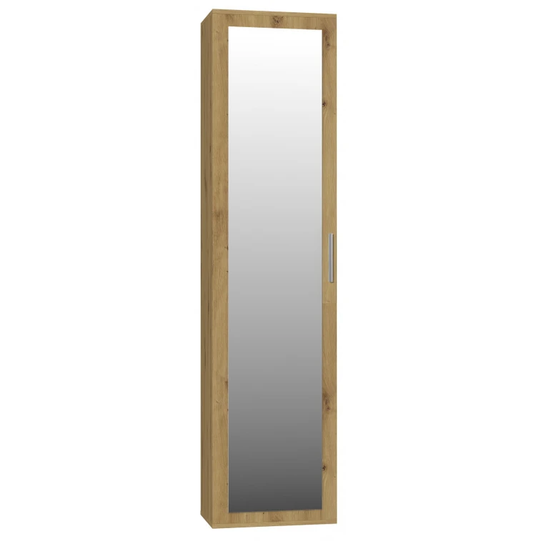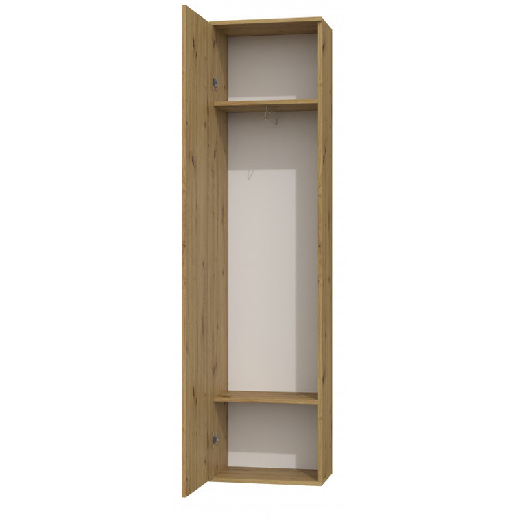 Skriňa v modernom štýle splní očakávania všetkých, ktorí oceňujú spojenie jednoduchosti a elegancie. Ideálna ponuka pre ľudí, ktorí ocenia krásny nábytok vo svojom byte. Vnútri šatníkovej skrine sú dve praktické police a držiak na ramienka.