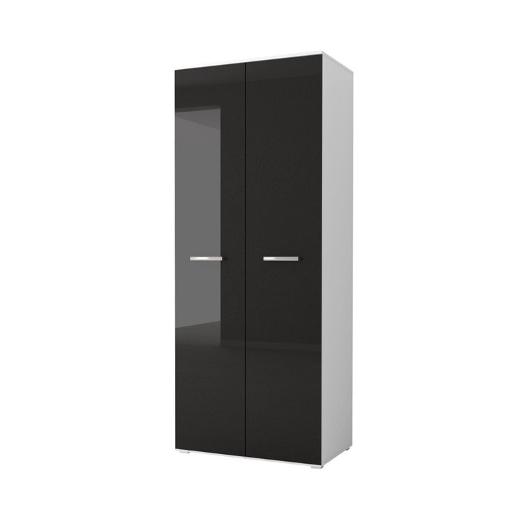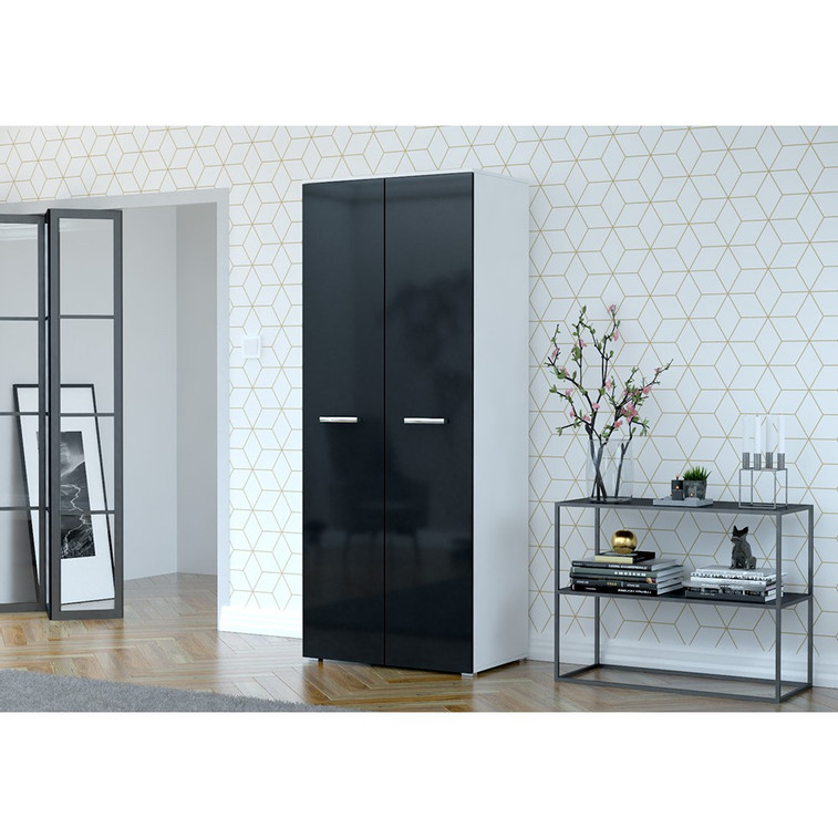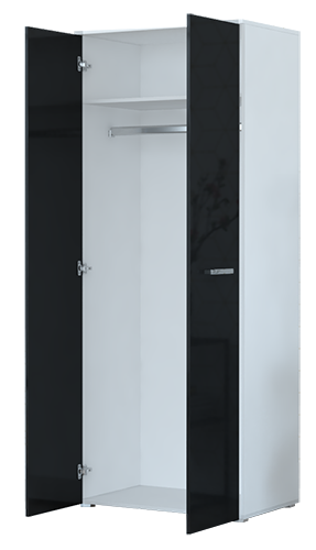 Dvojdverová šatníková skriňa, vybavená hlbokou policou a tyčou na ramienka.