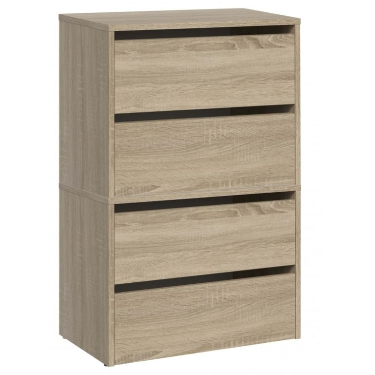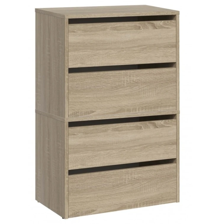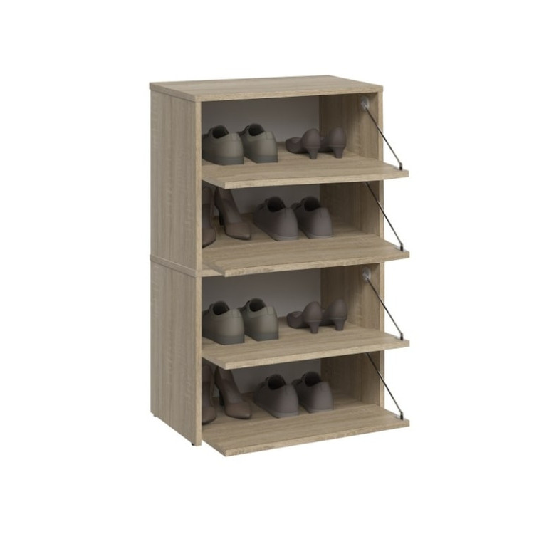Pohodlná skrinka na topánky MODO X2, ideálna do predsiene. Starostlivé spracovanie, elegantný vzhľad a originálna farba dodajú vašej predsieni nový lesk. Naša skrinka na topánky je vyrobená z 16mm oteruvzdornej laminovanej dosky. Výklopné dvierka zaisťujú funkčnosť skrinky. Za dvierkami sú 4 priestranné police na topánky.