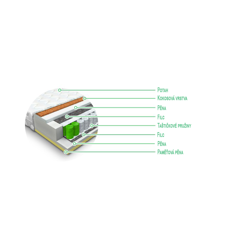 Veľmi kvalitný matrac, ktorý má na jednej strane visco pamäťovú penu. Na druhej strane je kokosová vrstva. Základom je vysoko kvalitný drôt 262 ks/m2. Každá pružina je umiestnená v samostatnom textilnom vrecúšku.