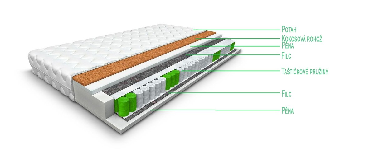 Pružiny - každá pružina je umiestnená v samostatnom textilnom vrecúšku. Matrac sa prispôsobí telesnej hmotnosti. Pružiny sú vyrobené z vysoko kvalitných certifikovaných drôtov.