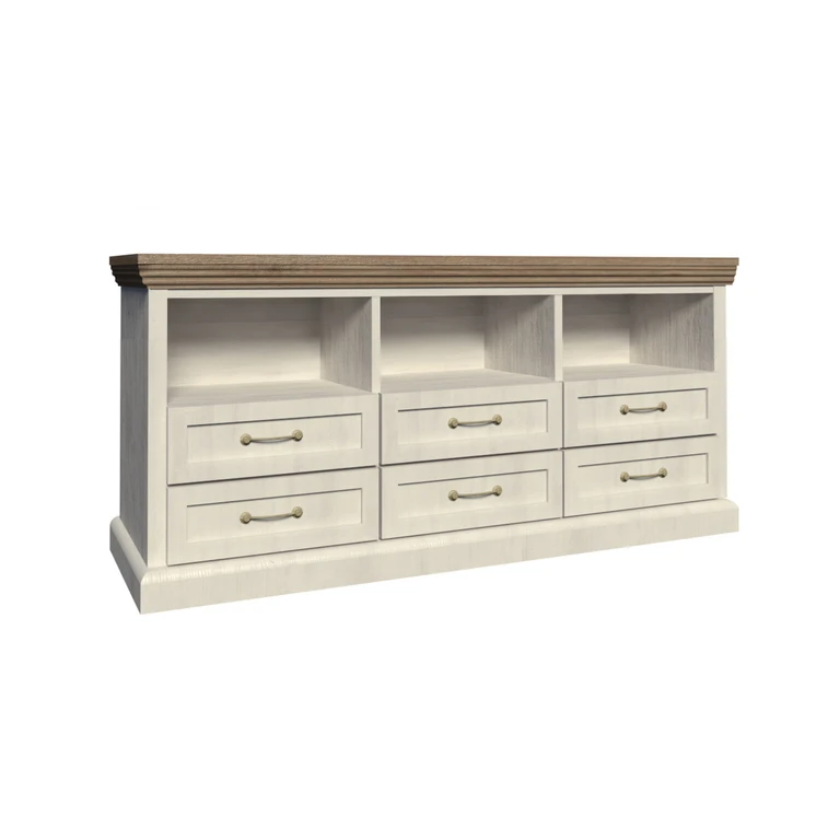 Televízny stolík Royal RS je vytvorený v anglickom štýle. Zostava nábytku vnesie do Vášho domova štýl a eleganciu. Nábytkom si môžete zariadiť celý svoj domov - jedáleň, spálňu, obývaciu izbu, kuchyňu alebo predsieň. Nábytok je vyrobený z veľmi kvalitného lamina v kombinácii s MDF vo farebnom prevedení Borovica nordická (korpus a predné plochy nábytku) s Dubom divokým (horné plochy nábytku). Úchytky sú kovové. Televízny stolík má 6 zásuviek a 3 police. Dodávame v demontovanom stave.