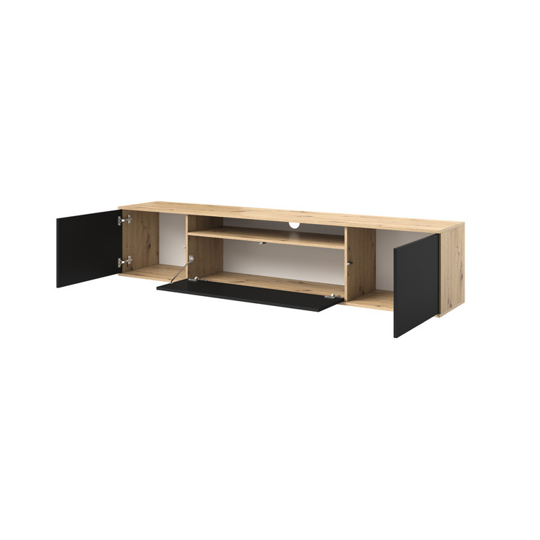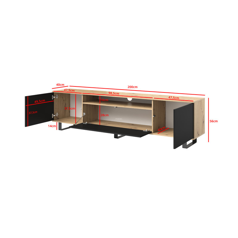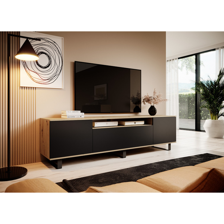 Televízny stolík RTV Logan. Je vyrobený z laminovanej dosky so štruktúrou dreva, ktorá vyzerá úžasne v každej miestnosti. Otváranie v systéme "PUSH TO OPEN" - stolík je vybavený mechanizmom, ktorý po ľahkom stlačení dvierka otvorí, vysoká kvalita. TV stolík je možné postaviť aj bez kovovej podnože, alebo zavesiť na stenu.