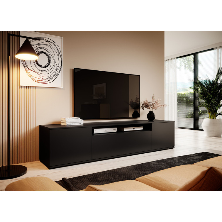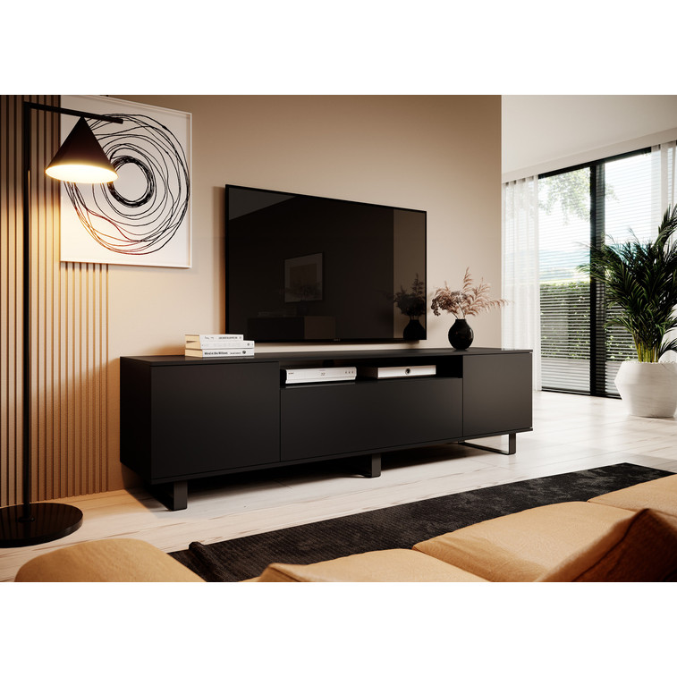 Televízny stolík RTV Logan. Je vyrobený z laminovanej dosky so štruktúrou dreva, ktorá vyzerá úžasne v každej miestnosti. Otváranie v systéme "PUSH TO OPEN" - stolík je vybavený mechanizmom, ktorý po ľahkom stlačení dvierka otvorí, vysoká kvalita. TV stolík je možné postaviť aj bez kovovej podnože, alebo zavesiť na stenu.