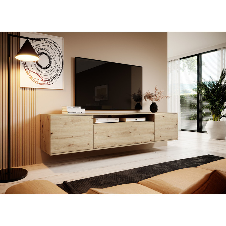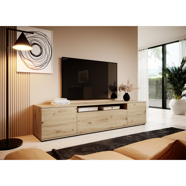Televízny stolík RTV Logan. Je vyrobený z laminovanej dosky so štruktúrou dreva, ktorá vyzerá úžasne v každej miestnosti. Otváranie v systéme "PUSH TO OPEN" - stolík je vybavený mechanizmom, ktorý po ľahkom stlačení dvierka otvorí, vysoká kvalita. TV stolík je možné postaviť aj bez kovovej podnože, alebo zavesiť na stenu.