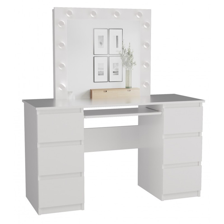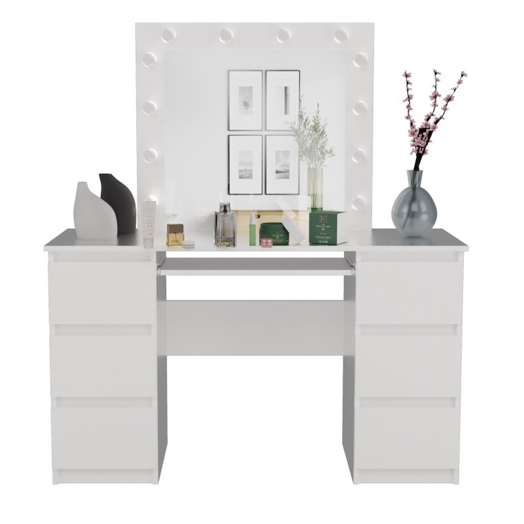 Toaletný stolík je vyrobený z pevnej laminovanej dosky, ktorá je odolná proti oderu a poškodeniu. Univerzálny vzhľad splní očakávania každého, kto ocenia kombináciu jednoduchosti a elegancie.