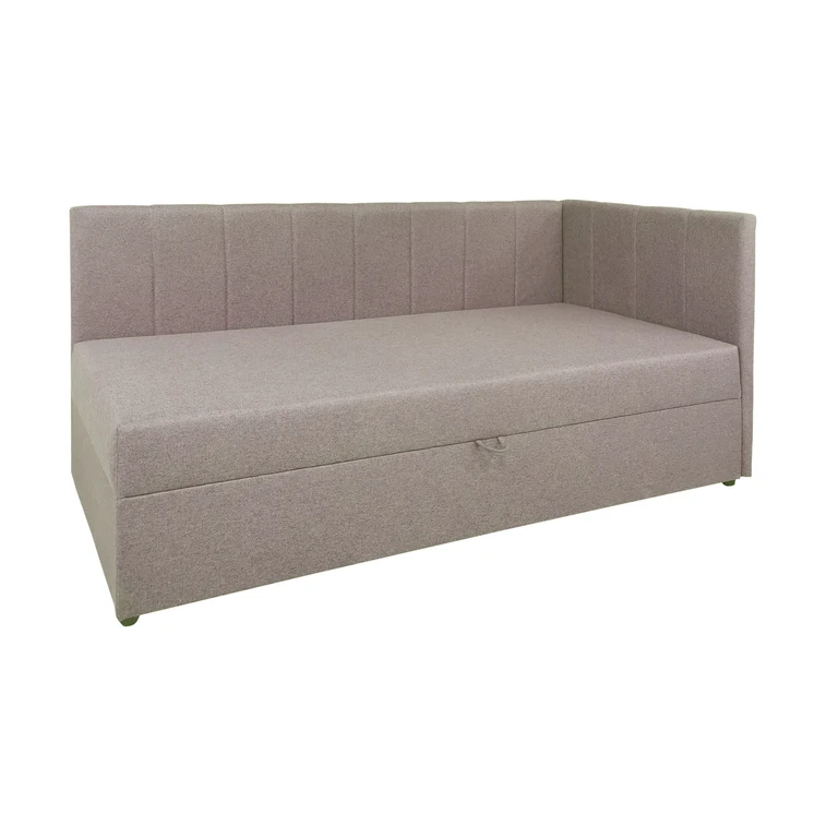 Jednolôžková váľanda s úložným priestorom a čelom.  Válenda je potiahnutá pevnou a odolnou tkaninou, ktorá je mäkká na dotyk.