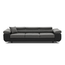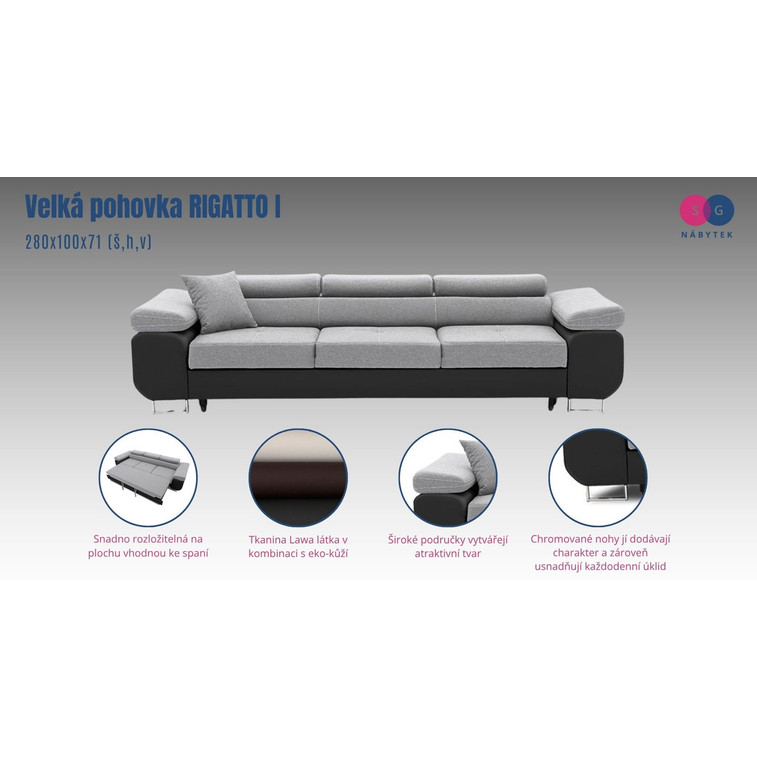 Rozkladacia pohovka RIGATTO I. Pevná konštrukcia z dreva a OSB dosky. Poťah z kvalitnej látky Lux s kombináciou eko-kože v mnohých moderných farebných odtieňoch.Jednoduché rozkladanie pohovky na lôžkovú podobu. Moderný dizajn vhodný do všetkých súčasných interiérov.