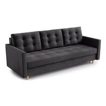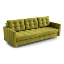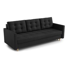 Veľká rozkladacia pohovka Sawa. Moderná pohovka v škandinávskom štýle má funkciu spania. Prešívaný sedák a vankúše ho odlišujú od ostatných kusov nábytku. Voľne stojaca pohovka (zadná stena potiahnutá látkou). Systém valčekového rozkladania. Masívne drevené nohy.