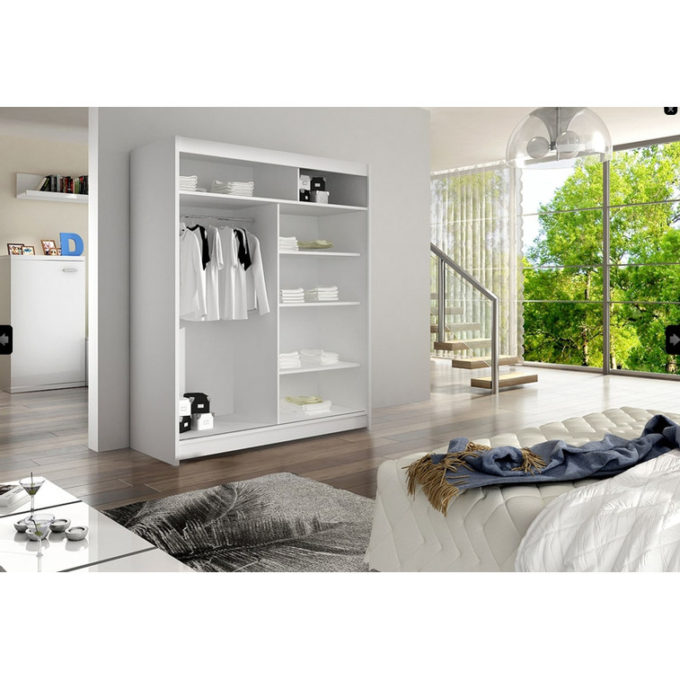 Šatníková skriňa WESTA XIV s posuvnými dverami je vo veľmi elegantnom a praktickom prevedení. Na dverách skrine sú zrkadlá. Vnútorná časť je vybavená policami, na pravej strane je umiestnená vešiaková tyč. Usporiadanie políc viď obrázok. Skriňa má hliníkové ložiskové pojazdy Micra Sevroll, korpus aj dvierka sú vyrobené z kvalitného lamina (16 mm). Dodávame v demontovanom stave.
