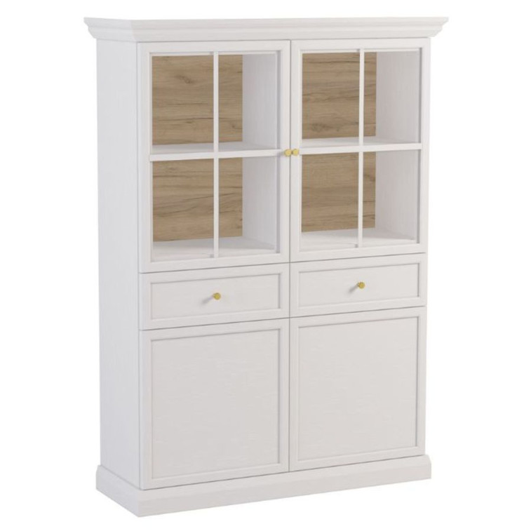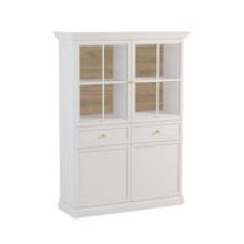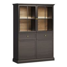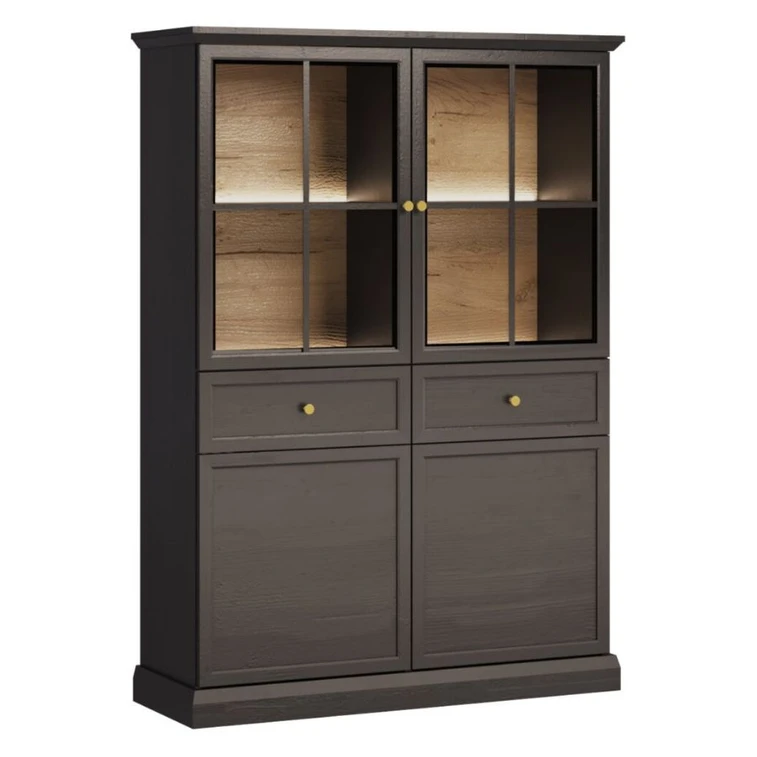 Praktická vitrína s presklenými dverami a LED osvetlením. Vnútri sú dve police na knihy alebo suveníry z ciest, ktoré budú vďaka osvetleniu skvele vystavené. Súčasťou vitríny je aj dve zásuvky na drobnosti a priestranné skrinky. Čiernohnedý alebo biely dekor s hlbokými prírodnými pórmi dreva má rôzne stupne lesku a pôsobí mimoriadne dynamicky a veľmi rozmanito. Kolekcia Lucca vám umožňuje voľne miešať klasický a moderný štýl.