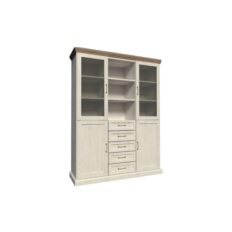 Vitrína Royal W2D je vytvorená v anglickom štýle. Zostava nábytku vnesie do Vášho domova štýl a eleganciu. Nábytkom si môžete zariadiť celý svoj domov - jedáleň, spálňu, obývaciu izbu, kuchyňu alebo predsieň. Nábytok je vyrobený z veľmi kvalitného lamina v kombinácii s MDF vo farebnom prevedení Borovica nordická (korpus a predné plochy nábytku) s Dubom divokým (horné plochy nábytku). Vitrína Royal je presne vyrobená pre zákazníkov, ktorí majú veľké množstvo dekoračných predmetov alebo kníh, ktoré by chceli vystaviť. Vďaka čiastočne preskleným dverám tejto vitríny je to možné. Táto vitrína má dve priestranné skrinky, praktické police aj päť hlbokých zásuviek. Ponúka veľký úložný priestor. Dodávame v demontovanom stave.