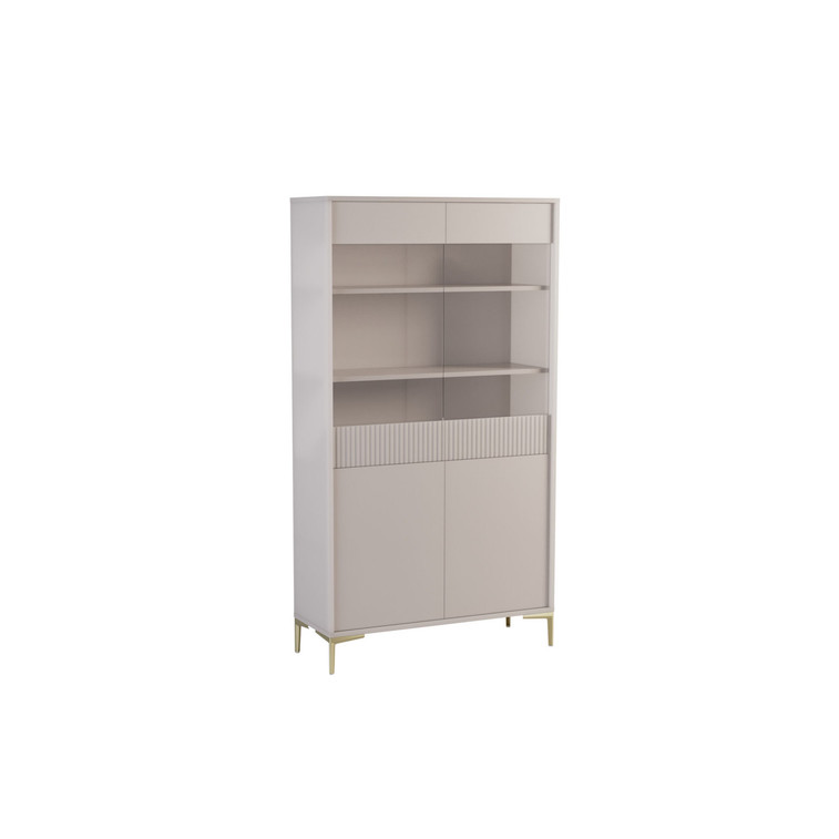 Praktická vitrína s presklenými dverami. Vnútri sú dve police na knihy alebo suveníry. Súčasťou vitríny sú aj dve priestranné skrinky. Vysoké kovové nohy umožňujú ľahký prístup pre vysávač.