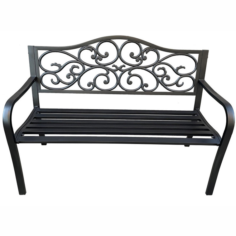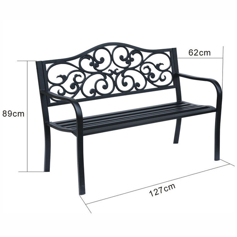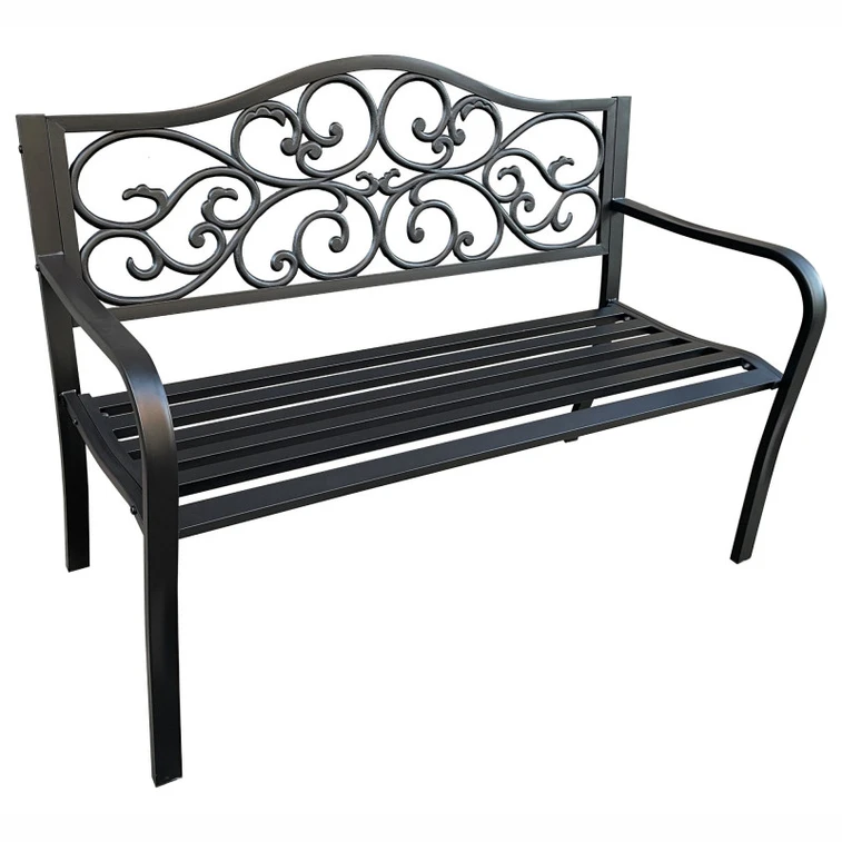 Záhradná lavička Irga s oceľovými nohami a liatinovým operadlom. Kovová záhradná lavička je krásnym a zároveň praktickým prvkom každej záhrady. Môže byť umiestnená na verande, pod pergolou alebo v záhradnom altánku. Bude skvelou dekoráciou a pohodlným miestom na oddych v letných dňoch.