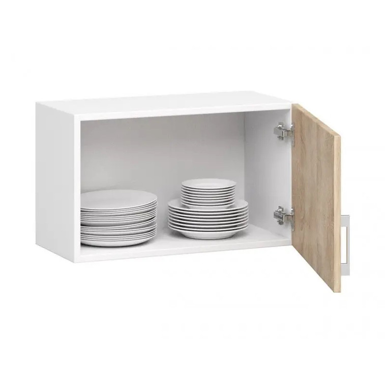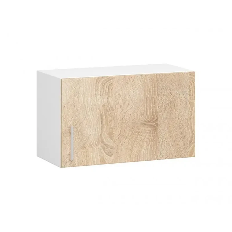 Pevná konštrukcia je zárukou životnosti, pevnosti a odolnosti proti oderu. Praktická skrinka navrhnutá na montáž s digestorom, umožňuje využiť voľný priestor na zabezpečenie možnosti uloženia vecí potrebných v kuchyni. Kolekcia LIMA, z ktorej predložený návrh pochádza, využíva dve najmódnejšie farby kuchynského nábytku – bielu a dub sonoma. Nábytok z lamina určite splní očakávania aj tých najnáročnejších zákazníkov, ktorí oceňujú jednoduchosť a eleganciu a ktorých prioritou je nájsť funkčný a ľahko čistiteľný.