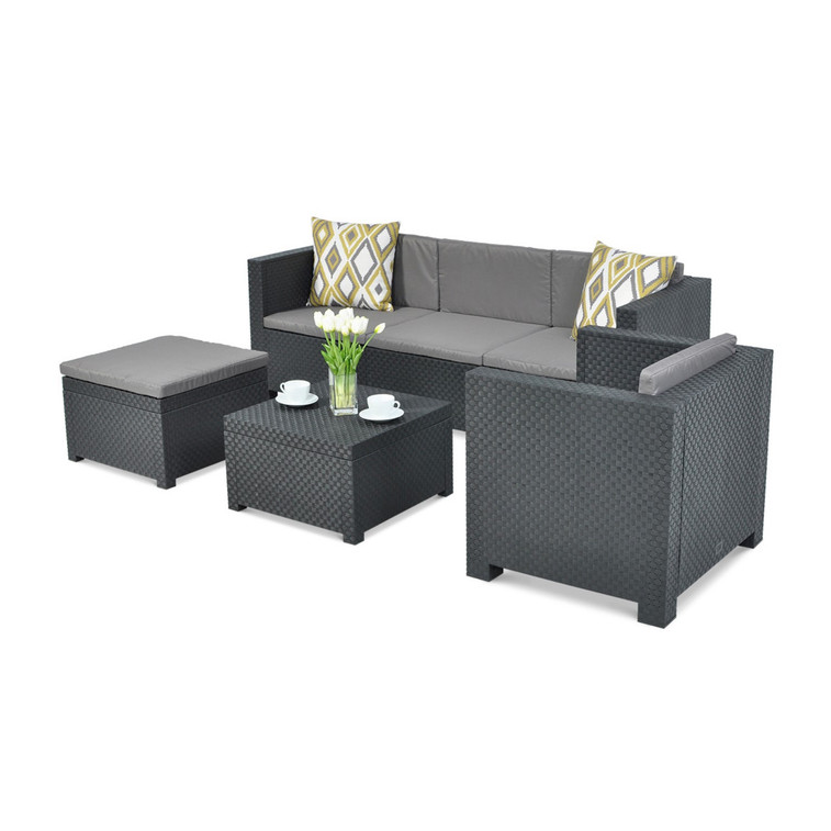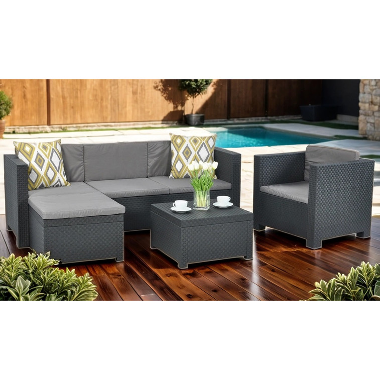 Vytvorte si s nami relaxačnú zónu pomocou nábytku, ktorý zaujme nielen svojim vzhľadom, ale taktiež poskytuje maximálne pohodlie. Či už chcete tráviť čas s rodinou alebo si len užiť chvíľku pre seba, sada záhradného nábytku NOMI vám umožní užiť si každý okamih vonku. Nábytok je vyrobený z kvalitného plastu s prírodnou ratanovou štruktúrou v grafitovej farbe.Modulárny dizajn, ktorý umožňuje ľubovoľne usporiadať tvar rohovej pohovky (ľavostranná, pravostranná).